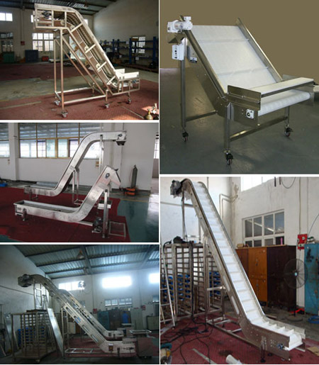 皮带式爬坡输送机 适用于楼层或高差间的货物的连续输送。倾斜角度小(≤30°)的爬坡皮带机,在皮带上加装档条、治具、裙边等方式从而使物体能在较大的角度上作提升输送。具有效率高、输送快、噪音低、不间断等特点。特别适合小物料的输送,如食品、注塑件、粉末以及各种零件行业。 用于上下楼层、斜坡地形、天桥等具有高差的平面之间的物品输送。在某些情况下可以代替升降机使用。 在输送颗粒状物品时为防止物品因重力滚落,每隔一段距离可以加一块挡板。皮带式爬坡输送机 是在皮带上加装挡条、治具、裙边等方式从而使物体能在较大的角度上作提升输送。具有效率高、输送快、噪音低、不间断等特点。特别适合小物料的输送,如食品、注塑件、粉末以及各种零件行业。爬坡式皮带输送机说明:皮带式爬坡输送机 是在皮带上加装挡条、治具、裙边等方式从而使物体能在较大的角度上本公司产品运行平稳,无噪声,可靠性好,耐磨耐用,使用寿命长。