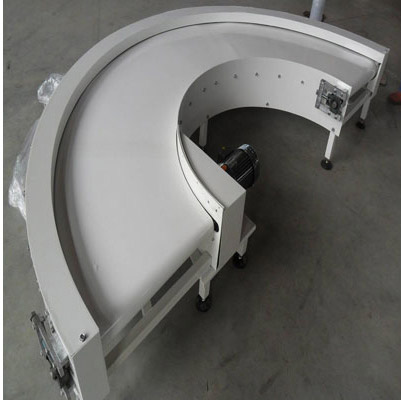 皮带式转弯输送机扇形皮带加装专用的防跑偏滚轮 (轴承外加聚甲醛POM)或者在输送带的外侧高频焊接导向筋使输送带运行在导轨中,辊筒采用专用的锥型包胶辊筒,广泛应用在食品、饮料、电子、烟草等行业,我们可以选用较小直径的滚筒,使转角连接更加方便,缓和解决过渡问题。
